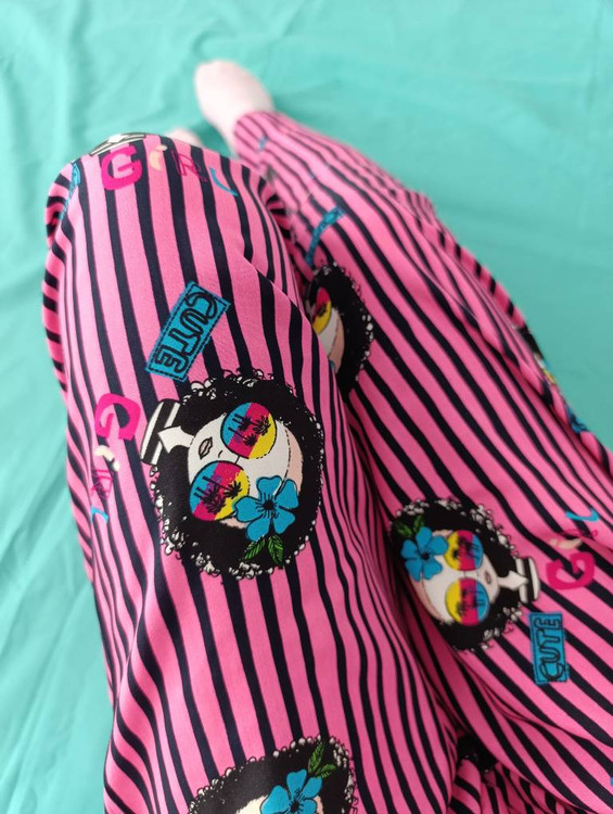 مرغک دارد. کمی آبروی دارد. پارچه اصلا کشسانی ندارد ، ولی در قسمت کمر ، کش کار شده است.