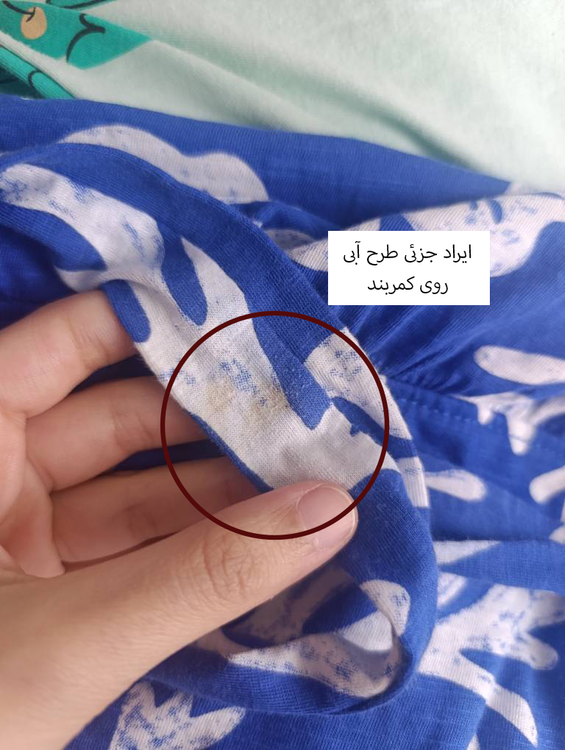 رنگ آبی ایراد جزیی دارد، به همین دلیل قیمت کمی پایین تر است. ( وجود لکه کمرنگ فقط روی کمربند لباس، در تصویر مشخص شده)